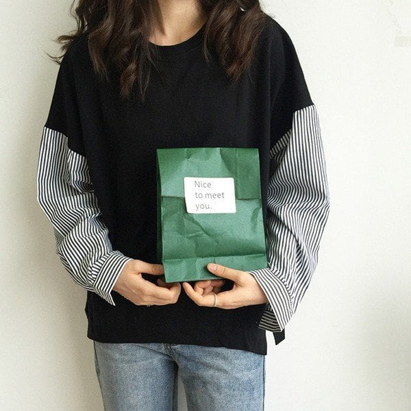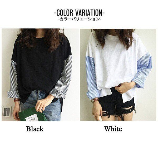 コピー:カットソー レディース シャツ 袖 ストライプ トップス 切り替え 異素材